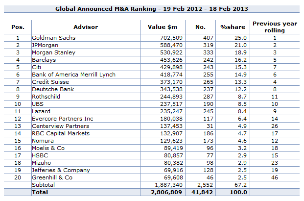 Quelle: Dealogic - Merger & Acquisitions Advisor Rankings (Anklicken zum Vergrössern)