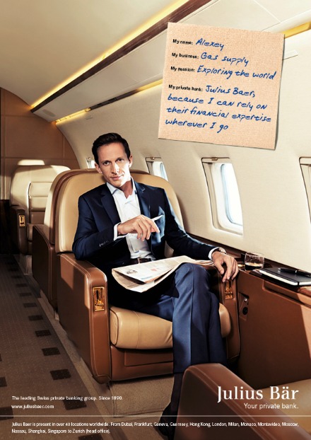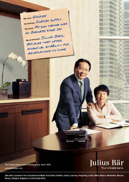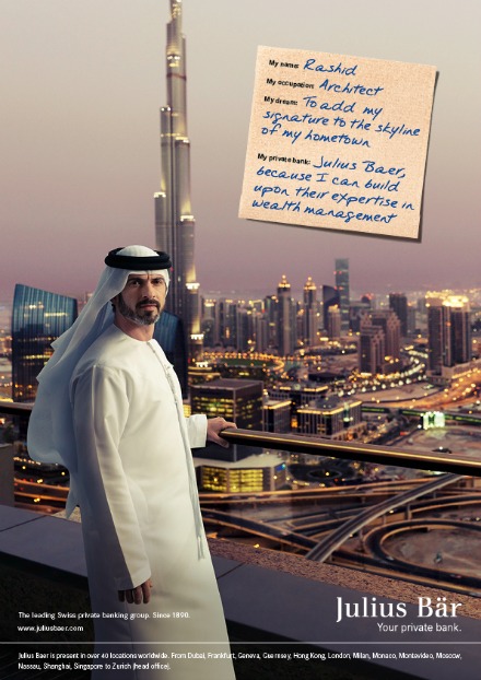 Die Kampagne wurde nun um drei Sujets, welche die Regionen Asien, Naher Osten und Russland repräsentieren, ausgeweitet. Die Kampagne wird international eingesetzt und zeigt Persönlichkeiten in ihrem privaten Umfeld sowie einem persönlichen Statement zur Julius Bär, wie das Medienportal «persoenlich.com» berichtet.