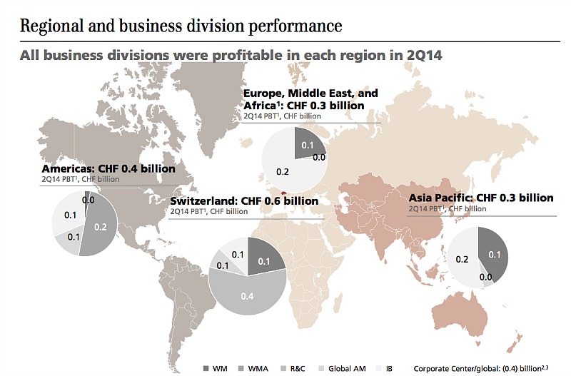 Vier Regionen und fünf Divisionen: Die UBS veranschaulicht auf einer Weltkarte, wo und wie sie im zweiten Quartal 2014 ihr Geld verdient hat. Alle Zahlen sind stark gerundet, aber sie vermitteln dennoch ein erhellendes Abbild der Gewinnströme der Bank.
