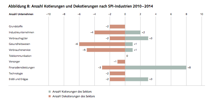 Den acht Neuzugängen – der grösste war die Cembra Money Bank 2013 – standen allerdings auch drei Abgänge gegenüber. So wurde die Bank Sarasin 2012 nach der Übernahme durch die brasilianische Safra-Gruppe dekotiert. Bei der National-Versicherungs-Gesellschaft, die 2014 von der Konkurrentin Helvetia übernommen wurde, soll dieser Schritt bald vollzogen werden.