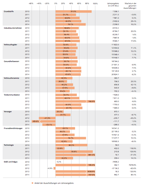 Wie sich zeigt (Grafik ganz unten), war der Trend bei den Ausschüttungsquoten zuletzt rückläufig. Besonders bei den Grossbanken UBS und Credit Suisse bangten die Eigner wegen hohen Busszahlungen in den vergangenen Monaten um ihre Dividende – umsonst, wie sich anlässlich der Jahresresultate 2014 zeigte.