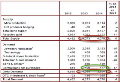 Denn die Zentralbanken erhöhten 2014 ihre Nachfrage um 17 Prozent gegenüber dem Vorjahr. Dennoch fiel der Goldpreis im gleichen Zeitraum um 20 Prozent. Ein ähnliches Bild zeigte sich bereits 2013 (vgl. Tabelle).