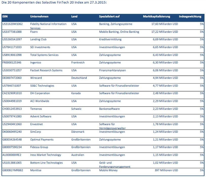Der Indexprovider Solactive aus Frankfurt hat einen Index ins Leben gerufen, der die 20 grössten Unternehmen aus dem Financial Technology (Fintech) Sektor abbildet.
