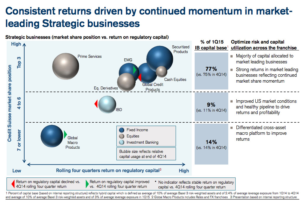 Eine von der CS am Dienstag veröffentlichte Grafik (unten) bringt das Dilemma auf den Punkt: Die Bank weist ein Übergewicht in volatilen und besonders kapitalintensiven Investmentbank-Bereichen auf.