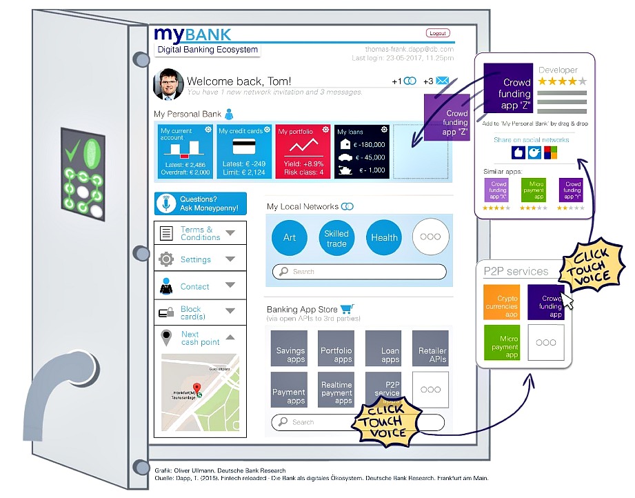 Eine moderne, plattformbasierte Online-Bank könnte gemäss Dapp demnach so aussehen: