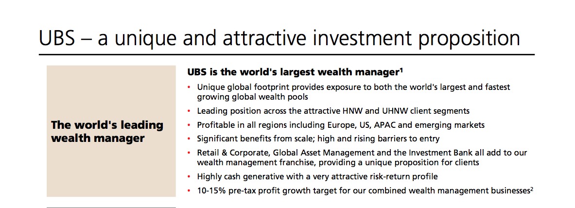 In der Präsentation zum ersten Quartalsergebnis 2015 findet sich eine weitere, interessante Feststellung: Die UBS betont nicht nur, dass sie die weltweit führende Vermögensverwalterin ist, sondern dass sie auch signifikante «Benefits» von ihren Skaleneffekten habe. Die Eintrittshürden auf diesem Niveau seien dementsprechend hoch – und würden noch weiter wachsen. Mit anderen Worten: Die UBS findet zu ihrer alten Grösse von vor der Finanzkrise zurück und wird so auch wieder unangreifbar; genauso wie 2006 und in der ersten Hälfte von 2007.
