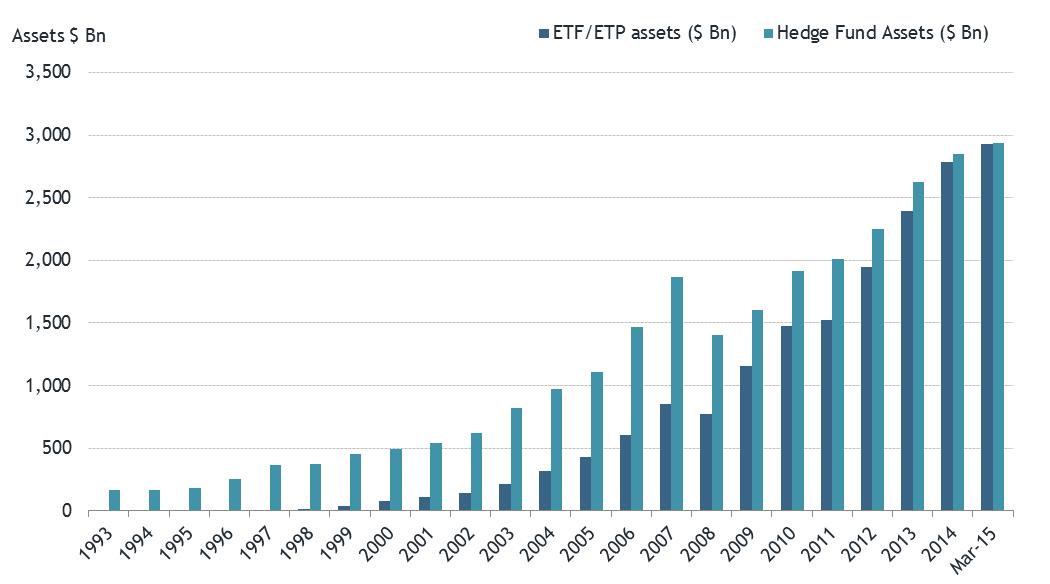 Die Zahlen von der renommierten ETF-Expertin Deborah Fuhr (Bild unten)– Gründerin der Beratungsfirma ETFGI in London – lassen aufhorchen: Im ersten Quartal 2015 haben Investitionen in ETF jene in Hedgefonds eingeholt (siehe Chart).