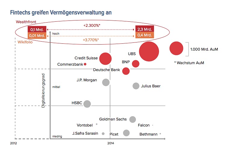 Allerdings: Ausruhen können sich die hiesigen Banken nicht. Denn es droht harsche Konkurrenz aus Übersee. Zu den weltweit erfolgreichsten rein digitalen Vermögensverwaltern gehören Betterment oder Wealthfront aus den USA. Letzterer verwaltet seit der Gründung vor zweieinhalb Jahren bereits knapp 2 Milliarden Dollar.