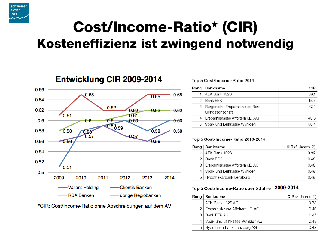 So konnten etwa die Spar- und Leihkasse Wynigen und die Ersparniskasse Affoltern im Emmental, beides kleine Bankhäuser mit Bilanzsummen von weniger als 250 Millionen Franken, in den vergangenen Jahren stets sehr tiefe Cost-Income-Ratios (Kosten-/Ertrags-Verhältnis) ausweisen.