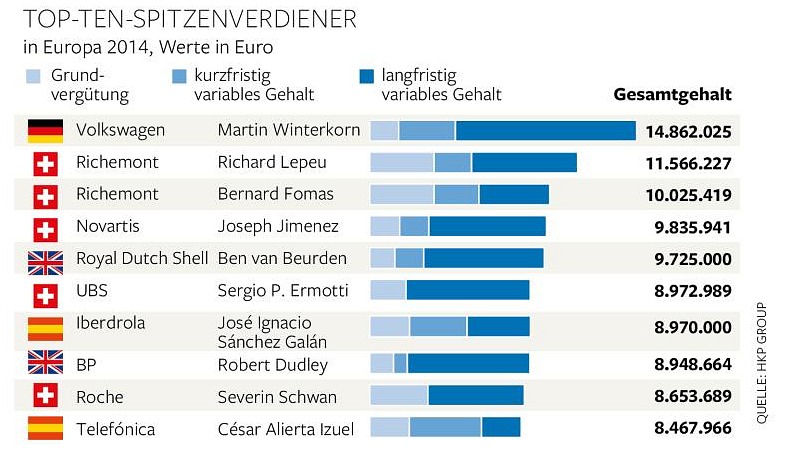 Auffällig ist auch: Von den zehn bestbezahlten CEO sind fünf Firmenlenker von Schweizer Unternehmen. Die beiden Co-Chefs des Genfer Luxusgüterherstellers Richemont, Richard Lepeu und Bernard Fomas, verdienten zusammen über 21 Millionen Euro.