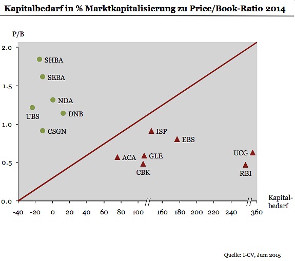 Diese Kluft wird besonders deutlich beim Kapitalbedarf. Dieser erreicht bei italienischen und spanischen Banken fast das Anderthalbfache ihrer aktuellen Marktkapitalisierung. Auch Banken in Deutschland, Österreich und Frankreich haben zum Teil hohen Kapitalbedarf (siehe nachstehende Grafik).