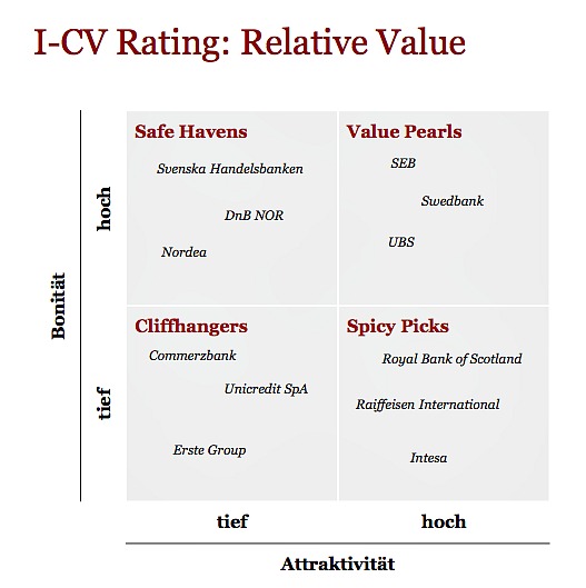 Nicht erwärmen können sich die I-CV-Leute für Finanzinstitute mit schwacher Bonität – also mit Ratings unter dem investierbaren Niveau von BBB. Das sind so genannte «Cliffhangers». Darunter fallen die deutsche Commerzbank, die österreichische Erste Group sowie die italienische Unicredit.