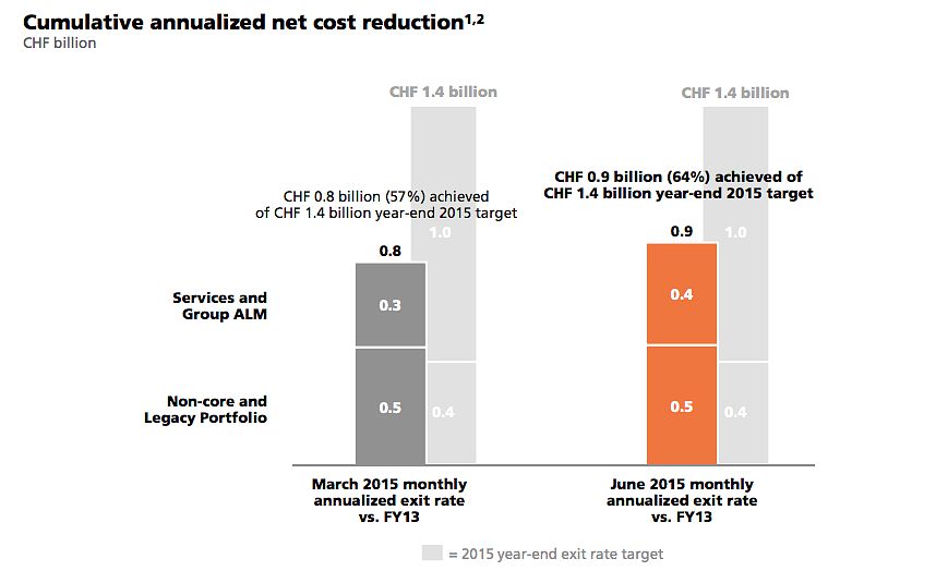 Vor drei Jahren gab die Geschäftsleitung ein Sparziel von 3,9 Milliarden Franken vor. Aus der aktuellen Ergebnis-Präsentation sind davon per Juni 2015 bereits 2,7 Milliarden Franken eingespart worden. Bis Ende 2015 sollen weitere 500 Millionen Franken weggeschnitten werden (siehe Grafik unten). Der Rest soll dann im Folgejahr eingespart werden.
