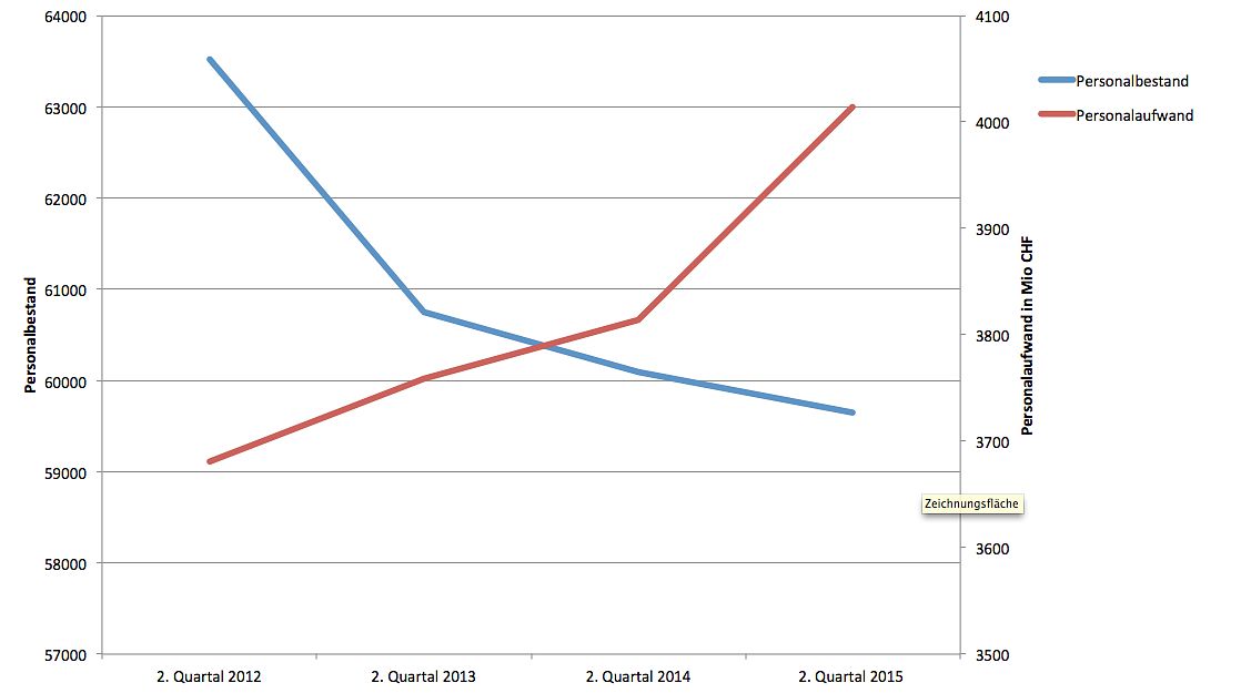 So betrug der Personalaufwand gemäss der Rubrik «personnel expenses (adjusted)» im 2. Quartal 2012 knapp 3,7 Milliarden Franken gut 63'500 Mitarbeitern. Im aktuellen Quartal liegen die Personalkosten bei etwas über 4 Milliarden Franken bei einem Bestand von unter 60'000.