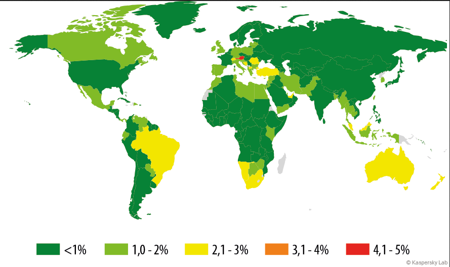 Die Schweiz belegt unter den Nationen, die am häufigsten über Bank-Trojaner attackiert wurden, weltweit den zehnten Platz (siehe Karte unten). Das vermeldete das russisch-deutsche IT-Sicherheitsunternehmen Kaspersky am Montag.