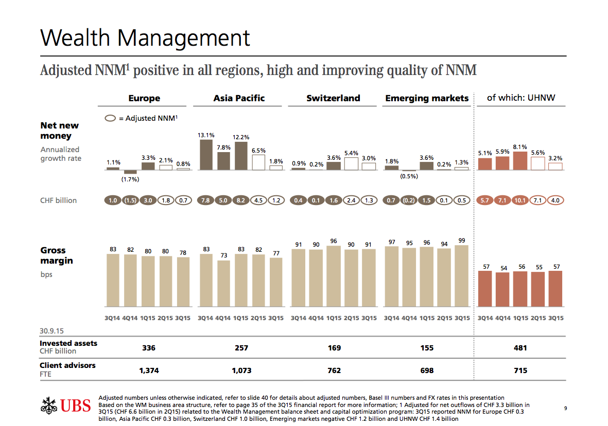 Und daran dürfte sich bis auf weiteres auch nichts ändern. Denn die Angst ist nun da und die Risikoaversion der Asiaten nimmt weiter zu angesichts der eingetrübten Wachstumsaussichten in China. Dieser Abkühlung trägt auch die UBS Rechnung, wie sich in den jüngsten Angaben zum dritten Quartal 2015 ebenfalls zeigt.
