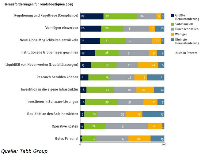 Stattdessen machen sie sich nämlich Sorgen wegen der rollenden Gesetzeswelle. Für über zwei Drittel der Befragten stellen Regulierung und Regeltreue eine grosse oder gar die grösste Herausforderung dar (siehe Grafik unten). Dies geht aus einer aktuellen Studie des amerikanischen Marktforschungsinstituts Tabb Group «Adapting for the Future: Boutique Asset Management Post-2017» hervor (Studie bezahlpflichtig).