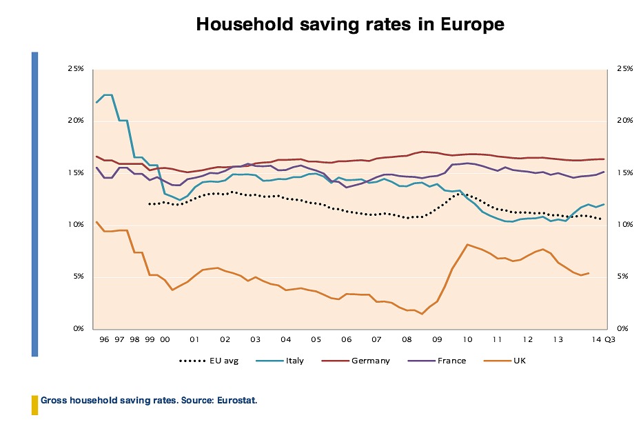 - Entgegen der allgemeinen Erwartung verfügen die Italiener durchaus über Erspartes. Die Sparquote liegt sogar über dem europäischen Durchschnitt, wie eine Grafik der Vereinigung der italienischen Vermögensverwalter zeigt.