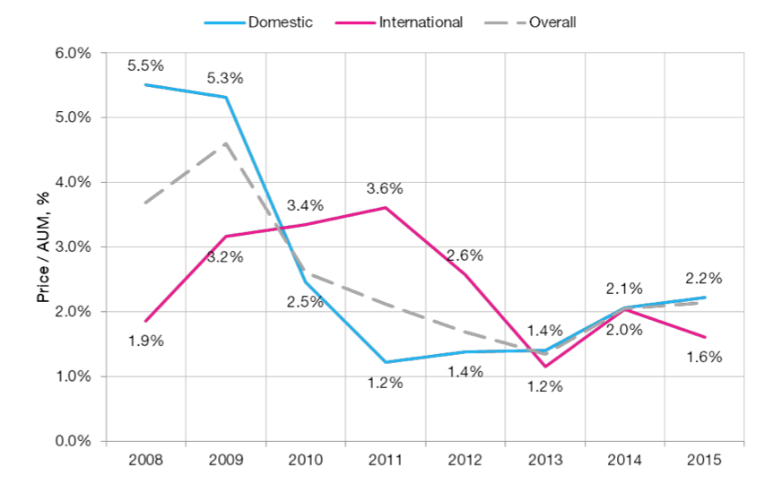 Ebenfalls leicht gestiegen sind die Preise. Sie kletterten weltweit von durchschnittlich 2,06 auf 2,14 Prozent der übernommenen Assets (siehe Grafik unten).