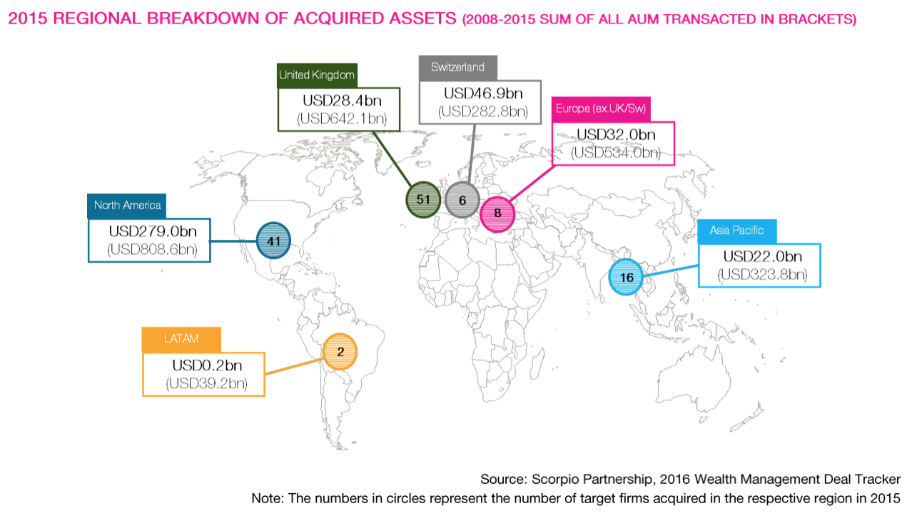 Angesichts der prominenten Deals von 2015 – etwa die Übernahme von Coutts International durch die Genfer UBP, die Fusion der Notenstein Privatbank mit der Basler Bank La Roche 1787, sowie die nun kurzlebige BSI-Übernahme durch die brasilianische BTG Pactual – darf der Befund von Scorpio Partnership eigentlich nicht verwundern.