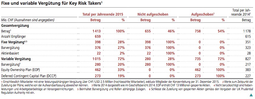 Diesem Grüppchen leistete die Schweizer Grossbank 2015 eine Gesamtvergütung von gut 1'5 Milliarden Franken (inklusive der Gesamtvergütung aller Konzernleitungs-Mitglieder) – das macht 2,25 Millionen Franken pro Kopf.