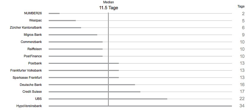 In einem Testergebnis machte Namics die Banknamen öffentlich: Die Anzahl Tage, bis ein Kunde eine Inlandüberweisung tätigen konnte. Für die Grossbanken Credit Suisse und UBS ist das Ergebnis kein Ruhmesblatt: Es dauerte bei ihnen 17 und 22 Tage.