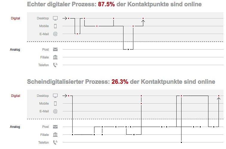 Namics nennt keine Banknamen, doch hätten in einem Fall 74 Prozent der Kontaktpunkte mit dem Kunden nicht in der digitalen Welt stattgefunden. Die untersuchten Herausforderer hätten hingegen echte Online-Erlebnisse geboten.