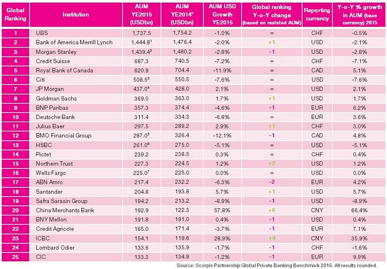 In der Rangliste der 25 grössten Vermögensverwaltungs-Banken der Welt dominieren europäische und angelsächsische Institute, wie die neuste Studie des Researchunternehmens Scorpio Partnership eindrücklich zeigt. Chinas Banken hingegen findet man erst auf den hinteren Rängen.