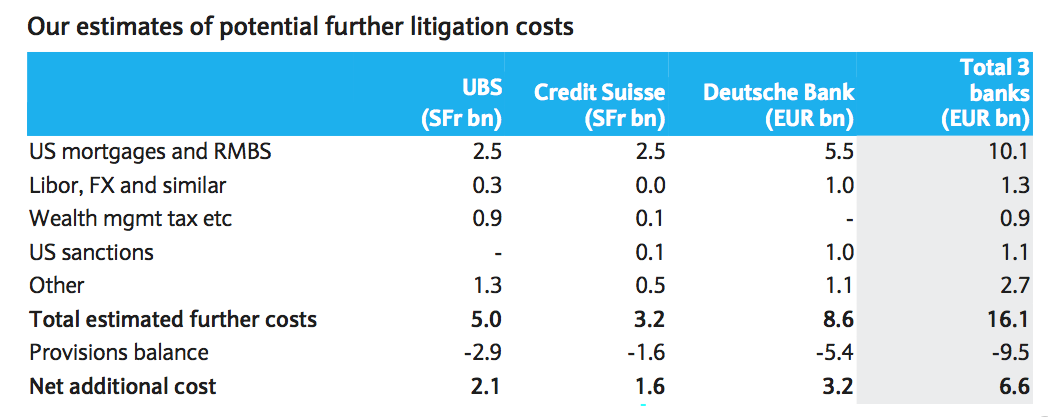 Und das ist noch nicht alles. Bis ins Jahr 2018 erwarten die Barclays-Experten bei der UBS neue Rechtskosten von insgesamt 5 Milliarden Franken für Bussen und Einigungen (siehe Tabelle unten). Bei der CS rechnen die Analysten mit 3,2 Milliarden Franken an Zusatzkosten.