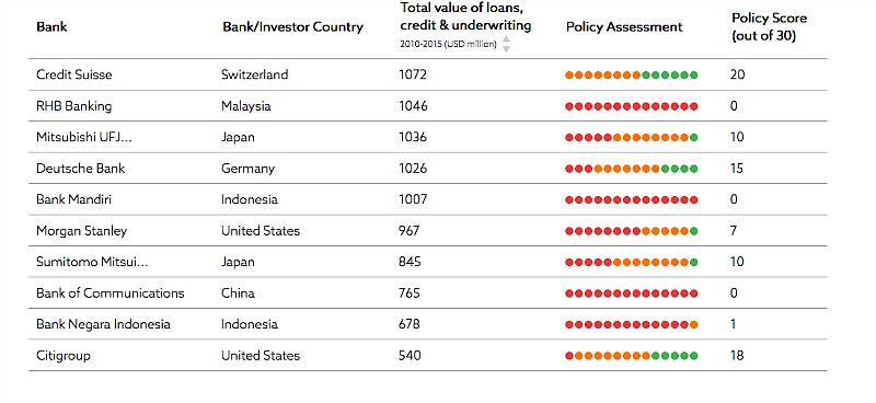 Damit zeigt die CS immerhin, dass ihre Geldströme in Richtung Risikounternehmen wohl einer Kontrolle unterstehen, womöglich aber Lücken in der Umsetzung der Reglemente bestehen. Viel schlechter stehen diesbezüglich Banken aus Malaysia, China, Japan und Indonesien da, die kaum über ESR-Standards verfügen.