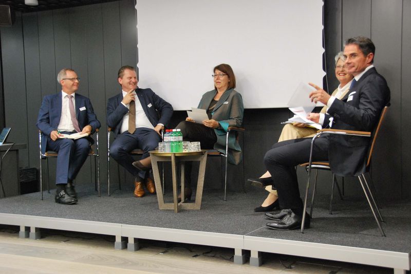 Im Panelgespräch skizzierten Philipp Perego, Leiter Banking Services, Swisscom; Ralph Siegl, Verwaltungsratspräsident der Bank Linth LLB und Managing Director der Confiseur Läderach; Renate Schwob; Roger Studer, Mitglied der Vontobel-Gruppenleitung und Leiter Investment Banking, unter Leitung von Moderatorin Corin Ballhaus, was Agilität in der Bankbranche konkret bedeutet.
