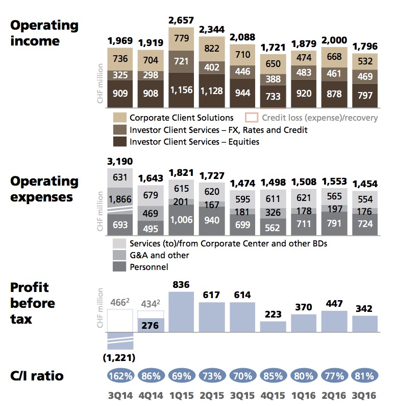 Die Atempause könnte sich nun als kurz erweisen. Der Vorsteuergewinn der Sparte halbierte sich im dritten Quartal 2016 gegenüber dem Vorjahr auf 342 Millionen Franken. Die wichtige Kosten-Ertrags-Rate (Cost Income Ratio CIR) stieg auf über 80 Prozent (siehe Grafik unten). Laut der UBS haben auch die Risikogewichteten Aktiven der Investmentbank in der Bilanz zugenommen; sie stiegen gegenüber dem Vorquartal um rund 1 Milliarde Franken.