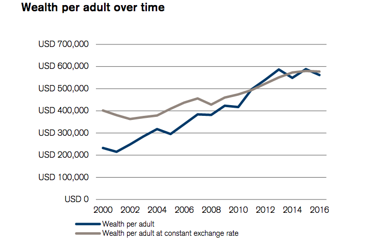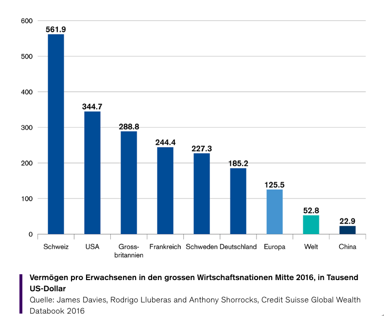 Während sich laut dem CSRI-Report die weltweiten Vermögen gegenüber dem letzten Jahr im Durchschnitt stagnierten und im Fall von Schwellenländern sogar stark rückläufig waren, verloren die Erwachsenen in der Schweiz im Schnitt «nur» 27'000 Dollar Vermögen.