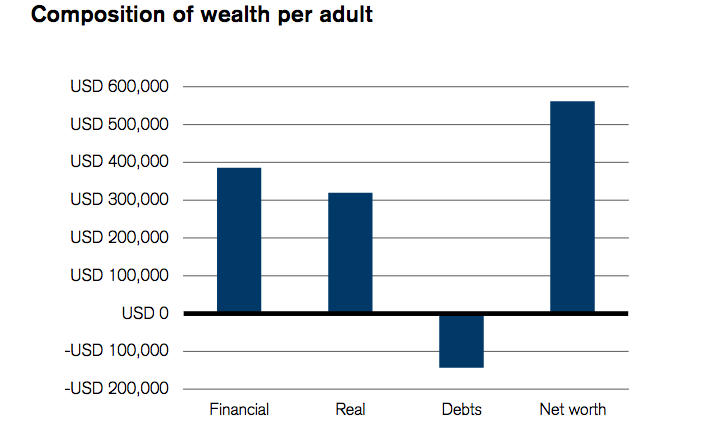 Laut den Statistiken des CS-Thinktanks, die im Gegensatz zu anderen Erhebungen auch Vorsorge-Vermögen, Immobilien und Landreserven berücksichtigen, verfügen Schweizer im Durchschnitt über 561'854 Dollar Vermögen, das Median-Vermögen für das Land liegt bei 244'002 Dollar. Die Schweizer sind der Studie zufolge damit elf Mal wohlhabender als der Durchschnitt der Weltbevölkerung (siehe Grafik unten).