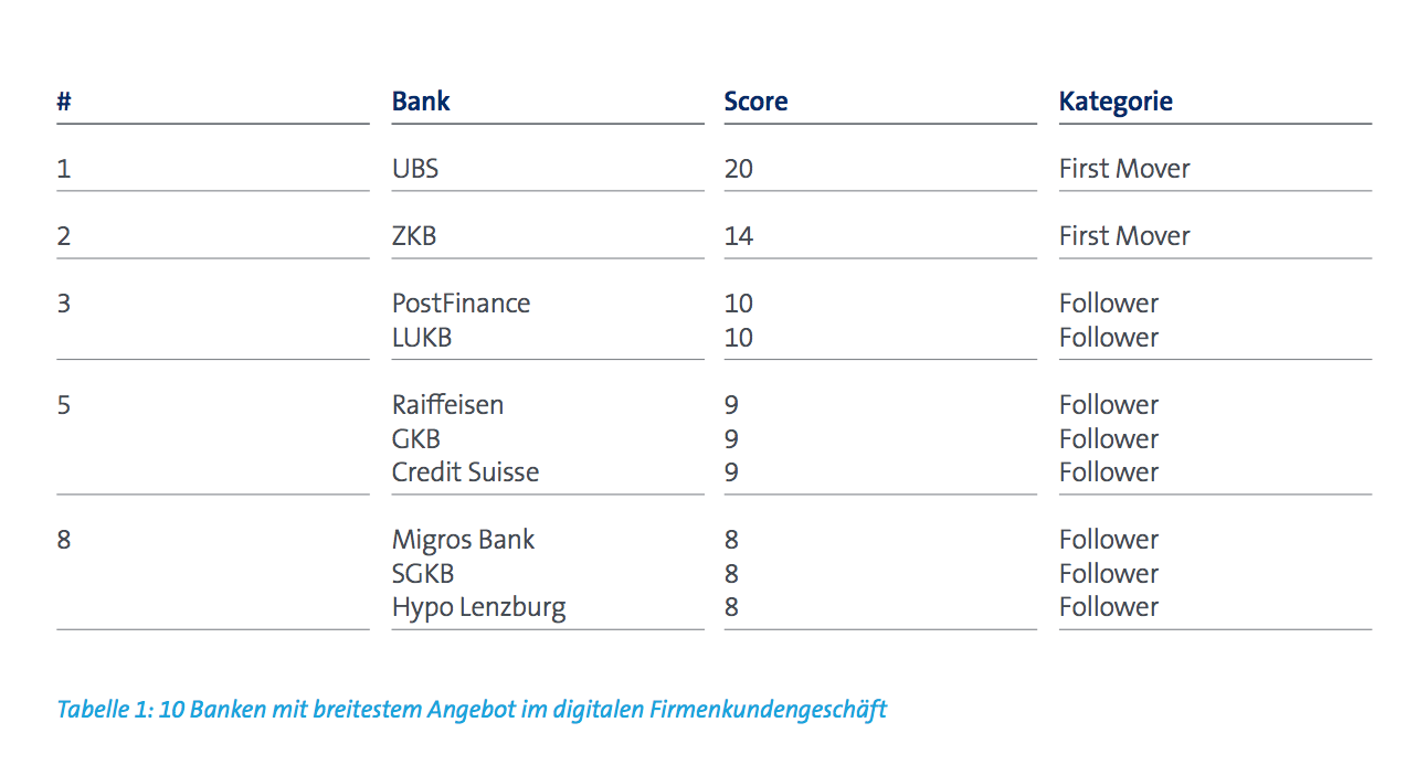 Gerade die grossen Banken im Land haben sich bei digitalen Angeboten für Firmenkunden besonders hervorgetan, wie ein Ranking der Studien-Autoren zeigt (siehe Grafik unten). Zu den so genannten First Mover zählen demnach die Grossbank UBS und die Zürcher Kantonalbank (ZKB).