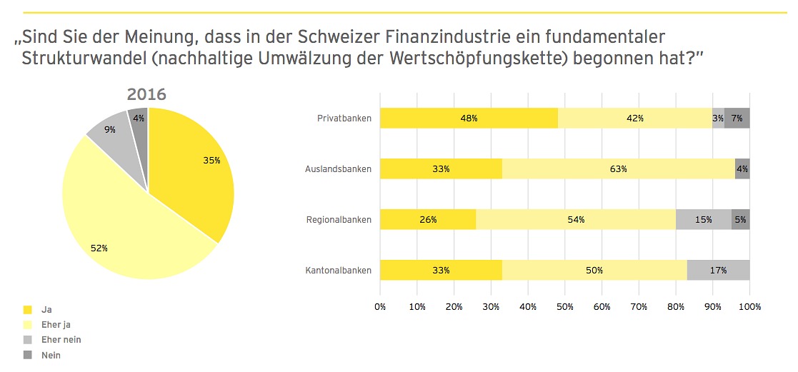 Die Bankenbranche sieht sich denn auch mit einem fundamentalen Strukturwandel hinsichtlich der nachhaltigen Umwälzung der Wertschöpfungskette konfrontiert. Dem pflichten 87 Prozent der Institute bei, wie die EY-Umfrage weiter zeigt (siehe Grafik).