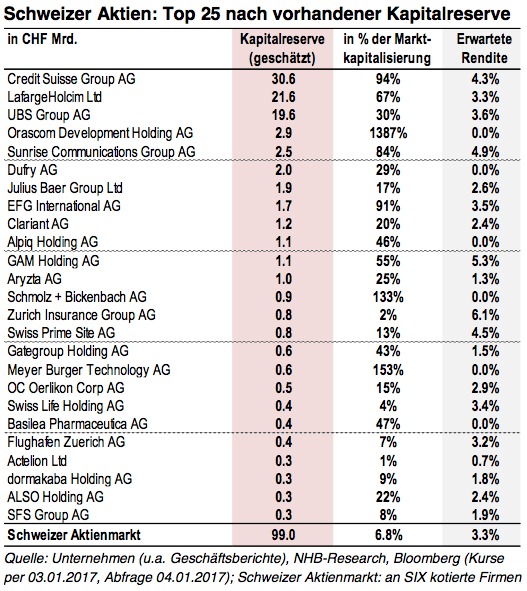 Überraschend: Hier schwimmen die CS und UBS obenauf, zusammen mit dem Zement-Konzern LafargeHolcim. Das Spitzentrio verfügt laut der NHB-Analyse über mehr als 70 Milliarden Franken an Kapitalreserven (siehe Tabelle).