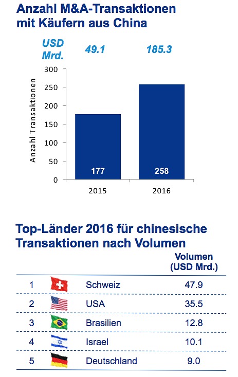 Umgekehrt gibt sich der Westen – insbesondere die Schweiz – deutlich liberaler, was Übernahmen seitens China anbelangt. Ein eindrückliches Beispiel ist die im März 2016 angekündigte Übernahme von Syngenta durch das staatlich kontrollierte Unternehmen ChemChina für mehr als 43 Milliarden Dollar. Laut KPMG ist die Transaktion die bisher grösste chinesische Übernahme eines Unternehmens im Ausland überhaupt.