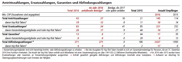 Interessant ist in dieser Aufstellung sicherlich, dass die Zahl der Key Risk Takers (KRTs), die 2016 eine Abfindungszahlung erhielten gegenüber dem Vorjahr zunahm, nämlich von 6 auf 17. Demgegenüber ging die Zahl der Empfänger einer Antritts- oder einer Ersatzzahlung sowie einer Garantie im Verlauf von 2016 zurück.