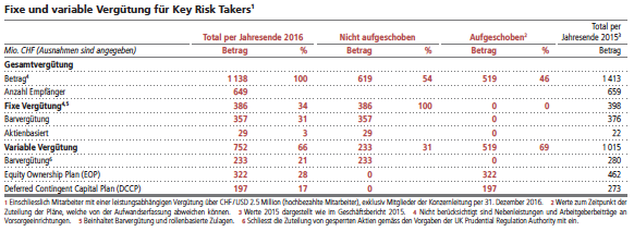 Dieser Rückgang dürfte ebenfalls auf den etwas schwächeren Geschäftsgang 2016 zurückzuführen sein, der sich in tieferen Kompensationen niederschlägt. Entsprechend verringerten sich innert Jahresfrist vor allem die variablen Vergütungen an die KRTs. Sie Zahlungen beliefen sich per Ende 2016 auf 752 Millionen Franken gegenüber 1,02 Milliarden Franken ein Jahr zuvor.