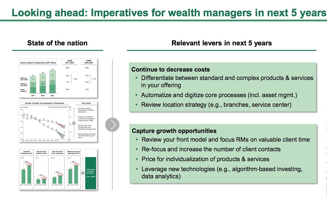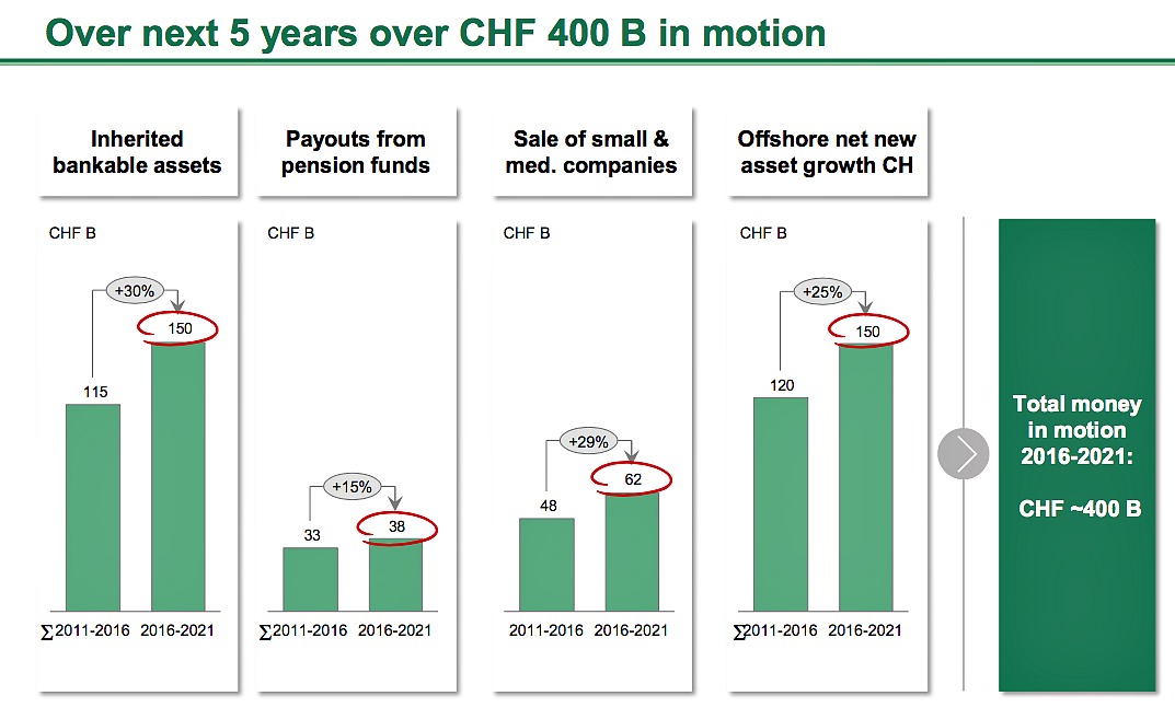 Gespiesen werden die Schatullen aus vier Quellen. So erhöhen sich beispielsweise die zu vererbenden Vermögen bis ins Jahr 2021 um 30 Prozent auf 150 Milliarden Franken. Und selbst die klassischen Offshore-Vermögen, also Gelder von Privatpersonen, die nicht in der Schweiz leben, werden in den kommenden fünf Jahren um 25 Prozet auf ebenfalls 150 Milliarden Franken anwachsen.