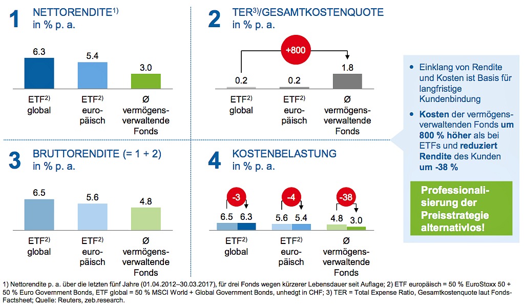 Die Kosten der vermögensverwaltenden Fonds sind somit um 800 Prozent höher als bei ETF und reduziert die Rendite des Kunden um 38 Prozent.