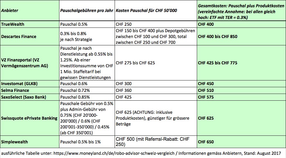 Demnach bietet der Zürcher Online-Vermögensverwalter Truewealth die günstigsten Konditionen. Die Verwaltung von 50'000 Franken bei Truewealth schlägt mit 400 Franken zu Buche. Darin enthalten sind eine Pauschalgebühr von 0,5 Prozent pro Jahr plus Produktkosten von 0,3 Prozent. Dabei handelt es sich um die sogenannte Total Expense Ratio (TER) der gewählten Exchange Traded Fonds (ETF) (siehe Tabelle).
