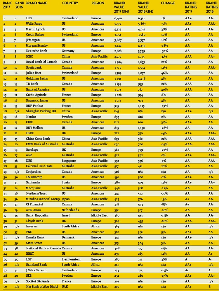 So zum Beispiel auch Brand Finance: Die Londoner Markenspezialisten haben ein globales Ranking der wertvollsten Wealth Manager erstellt – mit einem wenig überraschenden Sieger: Es ist wie bereits im vergangenen Jahr die UBS, die die US-Konkurrenten Wells Fargo und Merrill Lynch auf die Plätze verwies. Der Markenname der UBS ist demnach 6,4 Milliarden Dollar wert – praktisch gleich viel wie letztes Jahr.