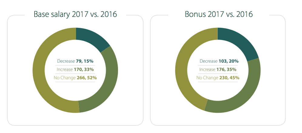 Demnach haben die Basissaläre bei mehr als der Hälfte der Umfrageteilnehmer im ersten Halbjahr 2017 stagniert. Nur gut ein Drittel sah den Fixlohn steigen, während sich 15 Prozent der Befragten mit weniger als im Vorjahr zufrieden geben mussten.