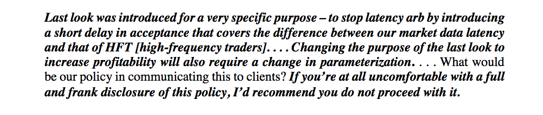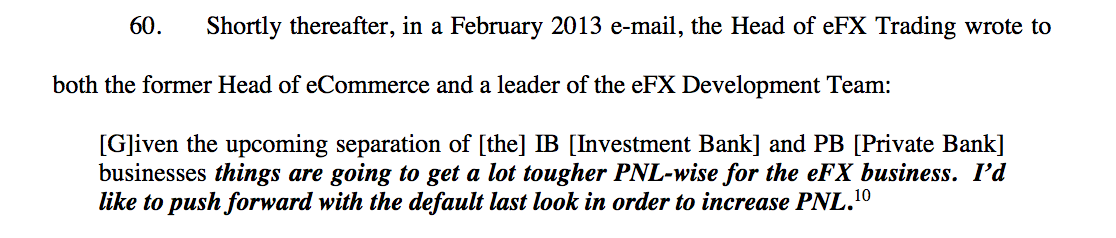 2013 hielt die Bank ihre Devisenhändler an, konsequent vom «last look» Gebrauch zu machen. «Die bevorstehende Trennung der Investmentbank und des Private Banking wird die Gewinne im Devisengeschäft belasten», schrieb ein Manager in einer internen Mail (siehe Ausschnitt unten). «Ich möchte mit Blick auf bessere Gewinne zum ‹last look› anhalten.»