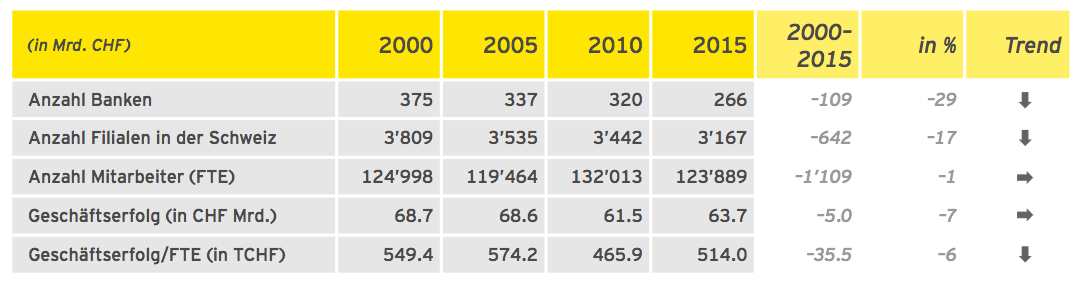 Allerdings muss den überlebenden Geldhäusern zugestanden werden, dass sie in einem garstigen Umfeld von tiefen und negativen Zinsen, starkem Franken, Margenschwund und Steuerstreit einige Widerstandskraft an den Tag gelegt haben. Denn auch diese Zahlen sprechen Bände: Die Kundeneinlagen haben sich seit dem Jahr 2000 verdoppelt, die Bilanzsummen stiegen fast um die Hälfte. Derweil sank die Anzahl der Mitarbeitenden trotz aller Sparprogramme nur um 3 Prozent, was gut 4'000 Vollzeitstellen entspricht (siehe Grafik unten).