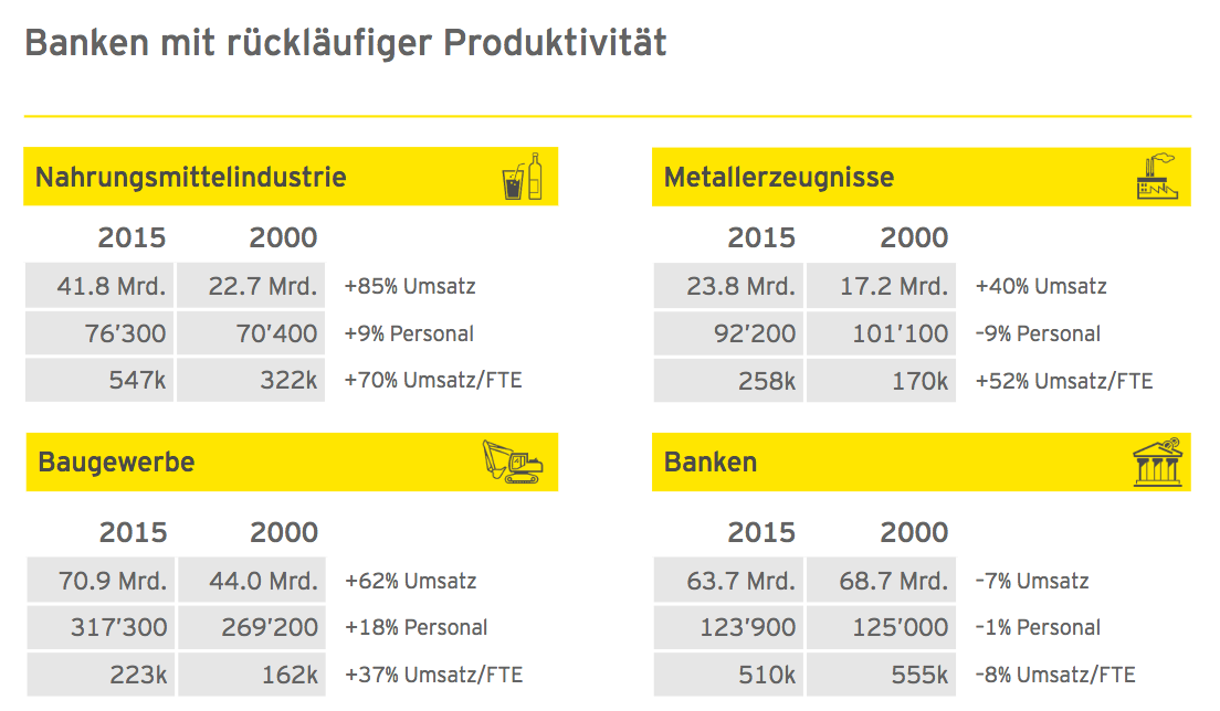 Hinzu kommt der schwindende Geschäftserfolg. Gegen die Margenerosion scheint bisher kein Kraut gewachsen zu sein. Zudem nimmt die Produktivität der Banker ab. Seit dem Jahr 2000 sank der Geschäftserfolg je Vollzeitstelle um 7 Prozent. Dies nimmt sich auch gegenüber anderen Branchen als dürftig aus (siehe Grafik unten).