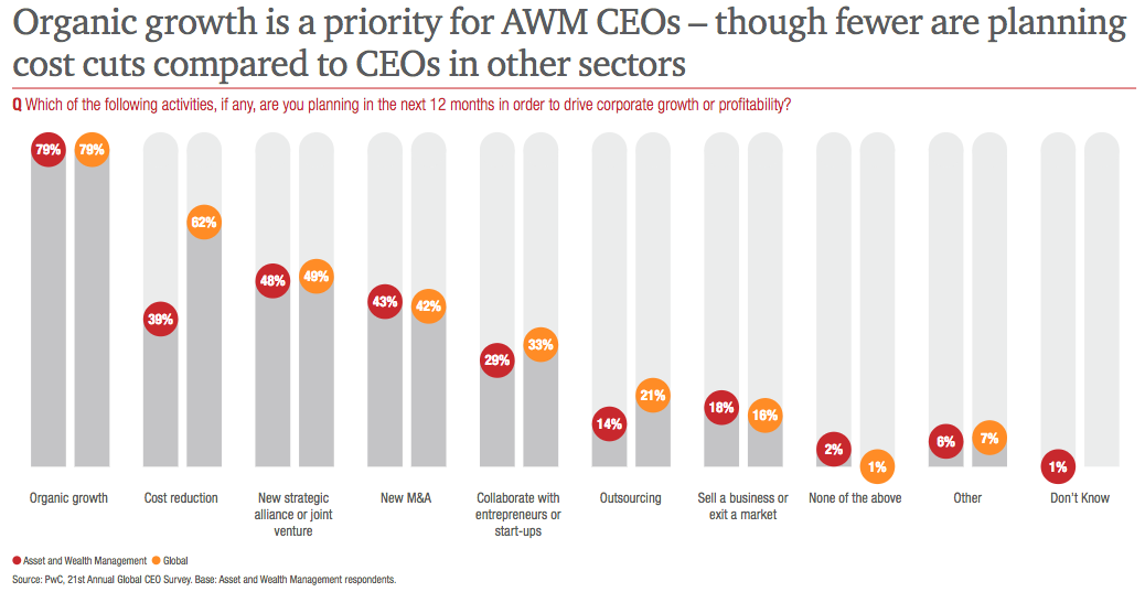 Exakt 39 Prozent der Umfrageteilnehmer gaben an, weiterhin sparen zu müssen (siehe Grafik unten). Was nicht verwundert, da die Gebühren insbesondere in den USA und Europa unverändert unter Druck sind. Ebenfalls rechnen die Chefs damit, dass die Konsolidierung in der Branche anhält. Immerhin 43 Prozent der Befragen positionieren sich hierbei als Käufer, womit der Fusionstrend ausgeprägter ausfällt als in anderen Sektoren.