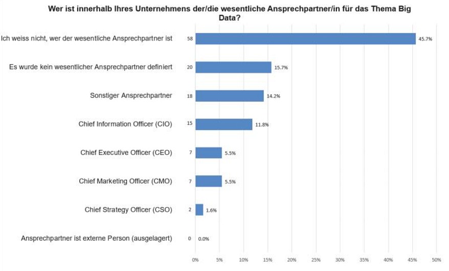 Auch die folgende Erkenntnis weist darauf hin, dass Big Data bei den Befragten – mehrheitlich Kundenberater – noch mit einigen Fragezeichen versehen ist. So gab fast die Hälfte der Befragten an, nicht zu wissen, wer der Ansprechpartner für das Thema in ihrem Unternehmen ist (siehe Grafik).